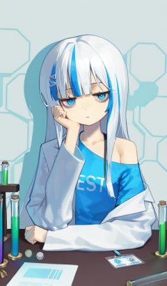 <lora:YoonYorry-Style:1.2>,upper body,1girl,solo,blue eyes,white hair,long hair,blunt bangs,(bags under eyes),blue streaked hair,blue t-shirt,long sleeves,hairclip,single bare shoulder,lab coat,id card,test tube,upper body,looking at viewer,(jitome:1.2),simple background,drop shadow,hexagon,desk,