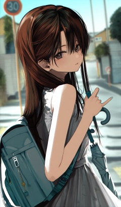 <lora:HonnryouHanaru-Style>,highres,absurdres,newest,very awa,masterpiece,best quality,year 2024,(upper body:1.6),1girl, umbrella, solo, long hair, dress, bag, holding, outdoors, backpack, white dress, motor vehicle, looking at viewer, closed umbrella, car, sleeveless, road, street, holding umbrella, black hair, brown hair, sleeveless dress, hair between eyes, road sign, blurry, bare shoulders, looking back, parted lips, blurry background, grey dress