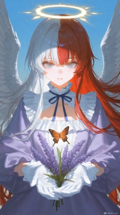 hewu,lightshadow,line art,split-color hair,two-tone hair,white hair,red hair,ribbon,XUER guangying,(Blue sky:0.7),(cloud:0.6),1girl,solo,long hair,looking at viewer,gloves,dress,ribbon,flower,frills,wings,white gloves,lavender dress,bug,butterfly,feathered wings,angel wings,depth of field,(rei \(sanbonzakura\):0.8),(ciloranko:0.7),(artist:quasarcake:0.8),(wlop:0.7),extreme aesthetic,(quasarcake:0.7),masterpiece,best quality,good quality,newest,year 2024,year 2023,very aesthetic,absurdres,Visual impact,A shot with tension,ultra-high resolution,32K UHD,sharp focus,best-quality,masterpiece,Emotionalization,unconventional supreme masterpiece,masterful details,temperate atmosphere,with a high-end texture,in the style of fashion photography,(Visual impact:1.2),insanely interplay between lights and shadows,(ray tracing),sunlight,reflective,masterful details,intricate details,soothing tones,high contrast,natural skin texture,soft light,sharp,giving the poster a dynamic and visually striking appearance,impactful picture,offcial art,colorful,splash of color,movie perspective,colorful,splash of color,(upper body:1.6),