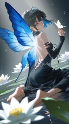 masterpiece,best quality,amazing quality,very aesthetic,absurdres,newest,in the style of fashion photography,light particles,cinematic lighting,Visual impact,sharp focus,Emotionalization,impactful picture,lens flare,depth of field,dynamic pose,dutch angle,extreme aesthetic,(dino_(dinoartforame):0.5),(yoneyama mai:0.5),(Yomu:0.3),(quasarcake:0.4),(wlop:0.3),line art,hewu,depth of field,(rei \(sanbonzakura\):0.8),(ciloranko:0.7),(artist:quasarcake:0.8),(wlop:0.7),extreme aesthetic,(quasarcake:0.7),masterpiece,best quality,good quality,newest,year 2024,year 2023,very aesthetic,absurdres,Visual impact,A shot with tension,ultra-high resolution,32K UHD,sharp focus,best-quality,masterpiece,Emotionalization,unconventional supreme masterpiece,masterful details,temperate atmosphere,with a high-end texture,in the style of fashion photography,(Visual impact:1.2),insanely interplay between lights and shadows,(ray tracing),sunlight,reflective,masterful details,intricate details,soothing tones,high contrast,natural skin texture,soft light,sharp,giving the poster a dynamic and visually striking appearance,impactful picture,offcial art,colorful,splash of color,movie perspective,colorful,splash of color,\,(close-up:1.3),(upper body:1.3),butterfly wings,black dress,butterfly,sitting,mini person,fairy wings,looking at viewer,minigirl,backless outfit,water drop,barefoot,white flower,looking back,bare back,floating hair,armlet,light particles,from side,hand up,lily (flower),headpiece,bare shoulders,from behind,smile,black ribbon,makeup,closed mouth,pale skin,bubble,holding flower,leaf,lotus,white butterfly,arm ribbon,blue wings,tiara,detached sleeves,looking to the side,solo focus,butterfly on hand,strapless,mask,glowing,transparent wings,back,lipstick,