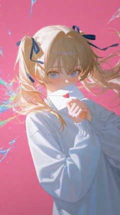 line art,hewu,depth of field,(rei \(sanbonzakura\):0.8),(ciloranko:0.7),(artist:quasarcake:0.8),(wlop:0.7),extreme aesthetic,(quasarcake:0.7),masterpiece,best quality,good quality,newest,year 2024,year 2023,very aesthetic,absurdres,Visual impact,A shot with tension,ultra-high resolution,32K UHD,sharp focus,best-quality,masterpiece,Emotionalization,unconventional supreme masterpiece,masterful details,temperate atmosphere,with a high-end texture,in the style of fashion photography,(Visual impact:1.2),insanely interplay between lights and shadows,(ray tracing),sunlight,reflective,masterful details,intricate details,soothing tones,high contrast,natural skin texture,soft light,sharp,giving the poster a dynamic and visually striking appearance,impactful picture,offcial art,colorful,splash of color,movie perspective,colorful,splash of color,\,blush,hair ribbon,heart,long sleeves,looking at viewer,covered mouth,{{one hand holding a love letter}}},upper body,pink background,
