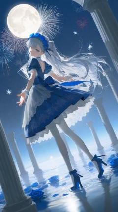 masterpiece,best quality,amazing quality,very aesthetic,absurdres,newest,in the style of fashion photography,light particles,cinematic lighting,Visual impact,sharp focus,Emotionalization,impactful picture,lens flare,depth of field,dynamic pose,dutch angle,extreme aesthetic,(dino_(dinoartforame):0.5),(yoneyama mai:0.5),(Yomu:0.3),(quasarcake:0.4),(wlop:0.3),line art,hewu,depth of field,(rei \(sanbonzakura\):0.8),(ciloranko:0.7),(artist:quasarcake:0.8),(wlop:0.7),extreme aesthetic,(quasarcake:0.7),masterpiece,best quality,good quality,newest,year 2024,year 2023,very aesthetic,absurdres,Visual impact,A shot with tension,ultra-high resolution,32K UHD,sharp focus,best-quality,masterpiece,Emotionalization,unconventional supreme masterpiece,masterful details,temperate atmosphere,with a high-end texture,in the style of fashion photography,(Visual impact:1.2),insanely interplay between lights and shadows,(ray tracing),sunlight,reflective,masterful details,intricate details,soothing tones,high contrast,natural skin texture,soft light,sharp,giving the poster a dynamic and visually striking appearance,impactful picture,offcial art,colorful,splash of color,movie perspective,colorful,splash of color,\,(close-up:1.3),(upper body:1.3),outstretched arm,reaching towards viewer,close-up,{{arch,column}},high heels,puffy short sleeves,blue dress,blue bow,white pantyhose,blue footwear,lace-trimmed dress,looking at viewer,smile,standing,water,see-through,moon,bug,star (sky),night sky,lace trim,starry sky,lolita fashion,blue theme,blue rose,snowflakes,head wreath,fireworks,dripping,pillar,flower wreath,looking back,