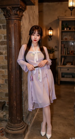 A woman wearing a light purple sheer dress (white bows, delicate patterns) leans against a carved wooden pillar in an ancient-style attic. Holding an object with tassels, she pairs white high-heeled shoes and thigh-high stockings. Adopt a medium-shot approach, capturing the dim warm lighting of the attic—antique shelves and traditional lanterns in the background—emphasizing retro ambiance and fabric details.