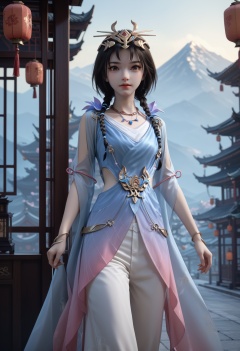 Ling,1girl,black hair,short hair,brown eyes,looking at viewer,jewelry,braid,necklace,twin braids,hair ornament,brown eyes,bracelet,<lora:Ling25_pony-000002:0.75>,white pants,blue dress,score_9,score_8_up,score_7_up,score_6_up,score_9,score_8_up,score_7_up,score_6_up source_anime,looking at viewer,standing,lantern,open window,looking at viewer,indoors,mountains,blossoms,flowers,east asian architecture,beautiful sunrise,warm ambient temperature,