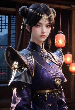 Li_shaoying,1girl,double bun,black hair,hair bun,lantern,long hair,twintails,necklace,hair ornament,gem,circlet,jewelry,<lora:Li_shaoying_25_pony:0.75>,fingerless gloves,thighhighs,chinese clothes,single thighhigh,black gloves,purple dress,long sleeves,armor,puffy sleeves,shoulder armor,pauldrons,photorealistic,hyperrealistic,<lora:Skin Color slider by topplok2:-1>,(pale skin:1.5),looking at viewer,score_9,score_8_up,score_7_up,score_6_up,score_9,score_8_up,score_7_up,score_6_up source_anime,standing,(upper body:1.2),close up,head shot,lantern,open window,looking at viewer,indoors,mountains,blossoms,flowers,east asian architecture,beautiful sunrise,warm ambient temperature,