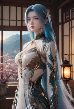photorealistic,hyperrealistic,Wang_qiuer,1girl,solo,blue hair,multicolored hair,blue eyes,gradient hair,looking at viewer,very long hair,dress,clothing cutout,white dress,cleavage cutout,<lora:Wang_qiuer_pony-000002:0.75>,(pale skin:1.5),<lora:Skin Color slider by topplok2:-1>,score_9,score_8_up,score_7_up,score_6_up,score_9,score_8_up,score_7_up,score_6_up source_anime,looking at viewer,standing,(upper body:1.2),close up,head shot,lantern,open window,looking at viewer,indoors,mountains,blossoms,flowers,east asian architecture,beautiful sunrise,warm ambient temperature,