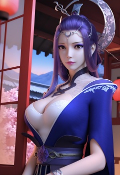 Yue_ji,1girl,purple hair,long hair,looking at viewer,circlet,cleavage,ring,large breasts,makeup,bracelet,jewelry,bare legs,anklet,earrings,blue dress,cape,chinese clothes,backless outfit,cleavage cutout,photorealistic,hyperrealistic,looking at viewer,<lora:Yue_ji_10_illu-000004:0.75>,standing,(upper body:1.2),close up,head shot,lantern,open window,looking at viewer,indoors,mountains,blossoms,flowers,east asian architecture,beautiful sunrise,warm ambient temperature,