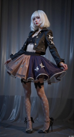 Full body shot from dramatic low-angle perspective, platinum blonde bob hairstyle model wearing [服装颜色] cropped jacket + gradient [裙色] chiffon skirt with embossed floral motifs, sheer lace-top stockings with translucent star constellations & white butterflies, Victorian black lace garters, mirrored stiletto heels with Swarovski bows, [场景描述], hyper-detailed fabric textures, cinematic prismatic lighting, Octane Render 8k, Vogue editorial style"