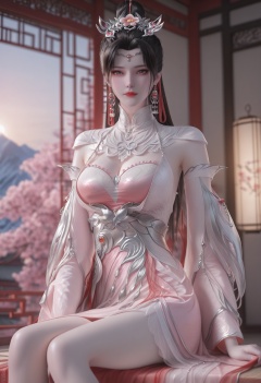 Liu_mei,1girl,bare legs,black hair,hair ornament,jewelry,hair bun,earrings,blurry background,mole under eye,makeup,hair bun,<lora:Liu_mei_10_illu-000005:0.75>,dress,white dress,pink dress,chinese clothes,long sleeves,clothing cutout,red hair ribbon,photorealistic,hyperrealistic,<lora:realistic filter [IL]:1>,(pale skin),looking at viewer,sitting,(large breasts:1.2),lantern,open window,looking at viewer,indoors,mountains,blossoms,flowers,east asian architecture,beautiful sunrise,warm ambient temperature,