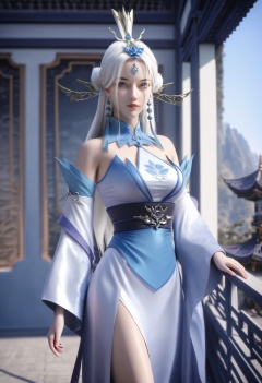 Donghuang_taixin,1girl,hair ornament,white hair,long hair,earrings,jewelry,bare shoulders,bare legs,blurry background,gem,circlet,hair stick,<lora:Donghuang_taixin_10_illu-000005:0.75>,dress,white dress,blue dress,detached sleeves,sash,chinese clothes,wide sleeves,ribbon,photorealistic,hyperrealistic,<lora:realistic filter [IL]:1>,(pale skin:1.1),looking at viewer,standing,lantern,open window,looking at viewer,indoors,mountains,blossoms,flowers,east asian architecture,beautiful sunrise,warm ambient temperature,
