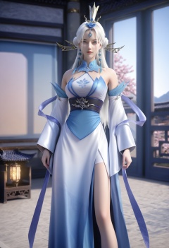 Donghuang_taixin,1girl,hair ornament,white hair,long hair,earrings,jewelry,bare shoulders,bare legs,blurry background,gem,circlet,hair stick,<lora:Donghuang_taixin_10_illu-000005:0.75>,dress,white dress,blue dress,detached sleeves,sash,chinese clothes,wide sleeves,ribbon,photorealistic,hyperrealistic,<lora:realistic filter [IL]:1>,(pale skin:1.1),looking at viewer,standing,lantern,open window,looking at viewer,indoors,mountains,blossoms,flowers,east asian architecture,beautiful sunrise,warm ambient temperature,
