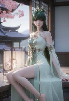 Fu_qu,1girl,green hair,hair ornament,long hair,bangs,blurry background,anklet,barefoot,purple eyes,bare shoulders,<lora:Fu_qu_10_illu-000004:0.75>,white dress,green dress,detached sleeves,see-through,gold trim,photorealistic,hyperrealistic,<lora:realistic filter [IL]:1>,(pale skin:1.2),looking at viewer,sitting,lantern,open window,looking at viewer,indoors,mountains,blossoms,flowers,east asian architecture,beautiful sunrise,warm ambient temperature,