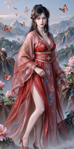 An ancient fairy with black hair lightly held by a camellia blossom hairpin, with red butterflies fluttering in her hair, adding passion and liveliness. She wears a fiery red gauze dress embroidered with blooming camellias and wildflowers, paired with elegant red high heels, showcasing the passion and vitality of spring. Standing on a spring mountain peak, overlooking distant花海and green mountains, with butterflies fluttering around her skirt, as if sharing the grandeur and beauty of spring. Her expression is gentle and lively, her eyes filled with ethereal charm, as if she were the guardian of the spring mountain peak.