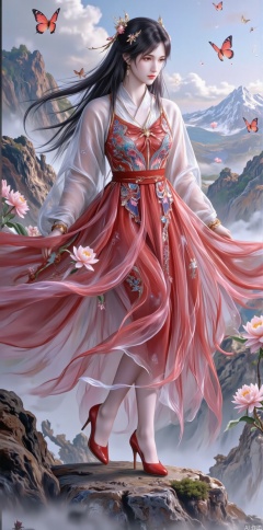 An ancient fairy with black hair lightly held by a camellia blossom hairpin, with red butterflies fluttering in her hair, adding passion and liveliness. She wears a fiery red gauze dress embroidered with blooming camellias and wildflowers, paired with elegant red high heels, showcasing the passion and vitality of spring. Standing on a spring mountain peak, overlooking distant花海and green mountains, with butterflies fluttering around her skirt, as if sharing the grandeur and beauty of spring. Her expression is gentle and lively, her eyes filled with ethereal charm, as if she were the guardian of the spring mountain peak.