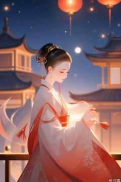 masterpiece, best quality, good quality, very aesthetic, absurdres, newest, 1girl, solo, hanfu, long hair, black hair, long sleeves, hair ornament, dress, holding, closed mouth, jewelry, outdoors, earrings, wide sleeves, hair bun, blurry, blurry background, night, chinese clothes, see-through,facial mark, looking down, moon, tassel, night sky, light particles, full moon, lantern, forehead mark, railing, architecture, east asian architecture, paper lantern, holding lantern,happy, Bright Festive Holiday Lights Lighting,
