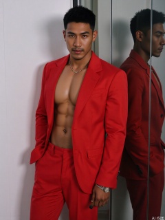 photo, Photograph of a muscular, dark-skinned man with a chiseled physique, wearing an open red suit jacket, revealing a toned, hairy chest. He stands confidently in front of a reflective surface, holding a cigar.