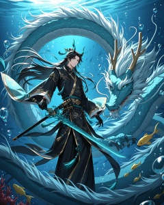 glow style, 1boy, weapon, long hair, dragon, sword, male focus, fish, bubble, jewelry, air bubble, eastern dragon, underwater, gloves, hair ornament, chinese clothes, earrings, black gloves, horns, sheath, wide sleeves, long sleeves, tassel