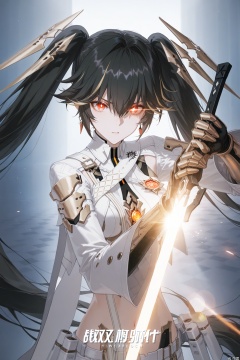 1girl, solo,lucia/punishing gray raven,blonde hair, black hair, red eyes,hair between eyes, twintails, jewelry, very long hair, multicolored hair, earrings, streaked hair, fighting_stance,weapon,brandishing a weapon,eye smear,glowing_eye,standing,the sword points to you,