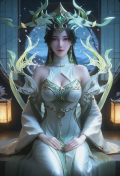Liu_shen,1girl,long hair,black hair,hair ornament,dark background,earrings,jewelry,facial mark,forehead mark,green hair,bare shoulders,streaked hair,multicolored hair,<lora:Liu_shen_10_illu-000006:0.75>,dress,white dress,long sleeves,cleavage cutout,chinese clothes,wide sleeves,photorealistic,hyperrealistic,<lora:realistic filter [IL]:1>,looking at viewer,(pale skin:0.9),sitting,lantern,open window,looking at viewer,indoors,mountains,blossoms,flowers,east asian architecture,beautiful sunrise,warm ambient temperature,