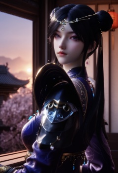 Li_shaoying,1girl,double bun,black hair,hair bun,lantern,long hair,twintails,necklace,hair ornament,gem,circlet,jewelry,<lora:Li_shaoying_10_illu-000006:0.75>,fingerless gloves,chinese clothes,black gloves,purple dress,long sleeves,armor,puffy sleeves,shoulder armor,pauldrons,photorealistic,hyperrealistic,(pale skin:0.9),pale face,<lora:realistic filter [IL]:1>,standing,(upper body:1.2),close up,head shot,lantern,open window,looking at viewer,indoors,mountains,blossoms,flowers,east asian architecture,beautiful sunrise,warm ambient temperature,