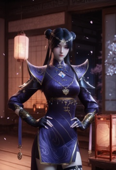 Li_shaoying,1girl,double bun,black hair,hair bun,lantern,long hair,twintails,necklace,hair ornament,gem,circlet,jewelry,<lora:Li_shaoying_10_illu-000006:0.75>,fingerless gloves,thighhighs,chinese clothes,single thighhigh,black gloves,purple dress,long sleeves,armor,puffy sleeves,shoulder armor,pauldrons,photorealistic,hyperrealistic,(pale skin:0.9),pale face,<lora:realistic filter [IL]:1>,looking at viewer,standing,hands on hip,lantern,open window,looking at viewer,indoors,mountains,blossoms,flowers,east asian architecture,beautiful sunrise,warm ambient temperature,