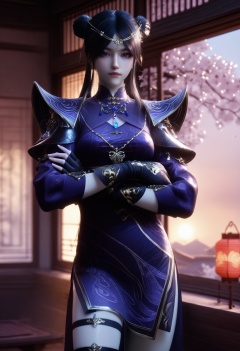 Li_shaoying,1girl,double bun,black hair,hair bun,lantern,long hair,twintails,necklace,hair ornament,gem,circlet,jewelry,<lora:Li_shaoying_10_illu-000006:0.75>,fingerless gloves,thighhighs,chinese clothes,single thighhigh,black gloves,purple dress,long sleeves,armor,puffy sleeves,shoulder armor,pauldrons,photorealistic,hyperrealistic,(pale skin:0.9),pale face,<lora:realistic filter [IL]:1>,looking at viewer,standing,crossed arms,kneeslantern,open window,looking at viewer,indoors,mountains,blossoms,flowers,east asian architecture,beautiful sunrise,warm ambient temperature,