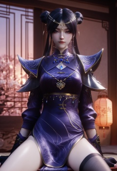 Li_shaoying,1girl,double bun,black hair,hair bun,lantern,long hair,twintails,necklace,hair ornament,gem,circlet,jewelry,<lora:Li_shaoying_10_illu-000006:0.75>,fingerless gloves,thighhighs,chinese clothes,single thighhigh,black gloves,purple dress,long sleeves,armor,puffy sleeves,shoulder armor,pauldrons,photorealistic,hyperrealistic,(pale skin:0.9),pale face<lora:realistic filter [IL]:1>,sitting,very thin thighs,slim thighs,lantern,open window,looking at viewer,indoors,mountains,blossoms,flowers,east asian architecture,beautiful sunrise,warm ambient temperature,