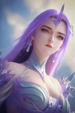 1girl, solo, long hair, looking at viewer, blue eyes, hair ornament, dress, jewelry, purple hair, earrings, portrait