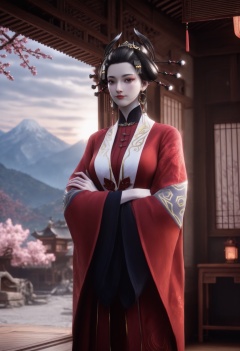 Yan_furen,1girl,black hair,looking at viewer,hair ornament,jewelry,brown eyes,earrings,hair stick,updo,hair pulled back,horns,hair stick,<lora:Yan_furen_10_illu-000010:0.75>,chinese clothes,wide sleeves,long sleeves,hanfu,red dress,photorealistic,hyperrealistic,<lora:realistic filter [IL]:1>,(pale skin:1.3),looking at viewer,standing,crossed arms,lantern,open window,looking at viewer,indoors,mountains,blossoms,flowers,east asian architecture,beautiful sunrise,warm ambient temperature,