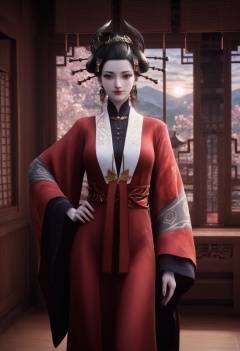 Yan_furen,1girl,black hair,looking at viewer,hair ornament,jewelry,brown eyes,earrings,hair stick,updo,hair pulled back,horns,hair stick,<lora:Yan_furen_10_illu-000010:0.75>,chinese clothes,wide sleeves,long sleeves,hanfu,red dress,photorealistic,hyperrealistic,<lora:realistic filter [IL]:1>,(pale skin:1.2),looking at viewer,standing,one hand on hiplantern,open window,looking at viewer,indoors,mountains,blossoms,flowers,east asian architecture,beautiful sunrise,warm ambient temperature,