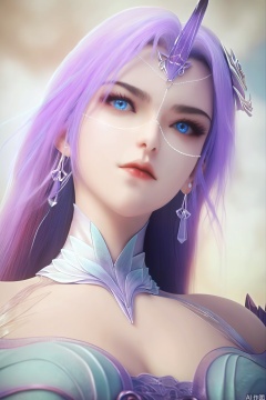1girl, solo, long hair,purple hair, earrings, looking at viewer, blue eyes, hair ornament, dress, bare shoulders, jewelry, closed mouth, upper body, photorealistic,