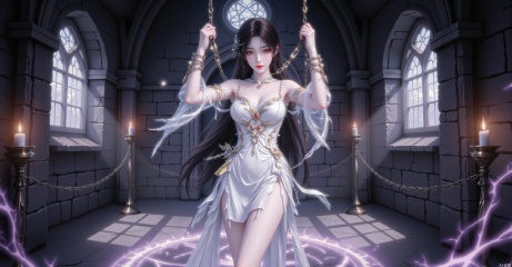 3. Props and Special Effects: There are chained candlesticks on both sides with burning candles. Surrounding are purple magic lights and lightning effects, creating a mysterious and magical atmosphere.