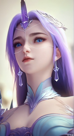 1girl, solo, long hair, looking at viewer, blue eyes, hair ornament, dress, jewelry, purple hair, earrings, portrait, photorealistic,