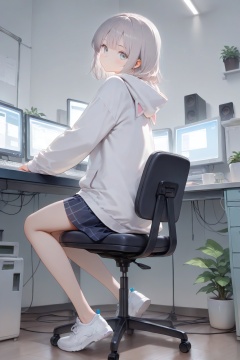 computer, 1girl, monitor, chair, solo, keyboard (computer), sitting, looking at viewer, indoors, hood, laptop, desk, swivel chair, grey theme, office chair, looking back, blue eyes, white footwear, hood down, closed mouth, plant, hoodie, white hoodie, shoes, speaker, grey hair, cable, skirt, on chair, cup, jacket, medium hair, short hair, muted color, from behind, potted plant, table, white jacket, white theme, crt, grey eyes