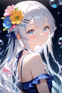 (masterpiece), (best quality), illustration, ultra detailed, hdr, Depth of field, (colorful),flower, 1girl, blue flower, solo, hair ornament, looking at viewer, blue eyes, bangs, long hair, bare shoulders, upper body, hairclip, black background, off-shoulder dress, off shoulder, white hair, blush, water drop, dress, closed mouth, bubble, hair flower, looking to the side, from side, blue ribbon, ribbon, blurry