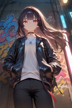 1girl,solo,long hair,looking at viewer,sharp eyes,bangs,jacket,shirt,black hair,hair ornament,long sleeves,urban street background,flowing hair,jewelry,closed mouth,standing,open clothes,choker,hairclip,black pants,necklace,bag,open jacket,white shirt,backpack,bandaid,zipper,leather jacket,graffiti wall,confident pose,hands in pockets,low angle shot,close-up,dramatic lighting,rim light,reflective light,soft shadows,detailed shading,cinematic atmosphere,wind blowing hair,urban night,neon reflections,dynamic composition,