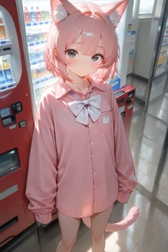 masterpiece,best quality,doremifaso64,1girl,solo,looking at viewer,shirt,long sleeves,bow,animal ears,standing,tail,pink hair,indoors,bowtie,black eyes,sleeves past wrists,feet out of frame,white bow,sleeves past fingers,pink shirt,oversized clothes,vending machine,sketch,