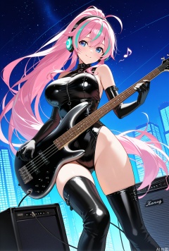 1woman playing bass_guitar,comfortable angle,full_body,big breast,solo, beautiful eyes,colorful long hair,streaked hair,ahoge,high ponytail,little smile, leather leotard, elbow gloves,lovestruck,headphone,thighboots, speaker,amplifier,swirling musical note, starry sky,skyscraper, textures,detailed texture,very detailed face, masterpiece,best quality,good quality,very awa,very aesthetic,absurdres,newest,