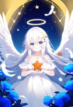 english text,watermark,1girl, angel, angel_wings, blue_eyes, blue_flower, constellation, crescent, cross, dress, feathered_wings, flower, hair_between_eyes, hair_ornament, halo, long_hair, looking_at_viewer, planet, solo, star_\(sky\), star_\(symbol\), star_hair_ornament, star_print, starfish, starry_background, starry_sky, very_long_hair, white_feathers, white_hair, white_wings, wings