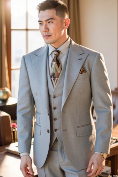 A man in  light gray formal suit, paired with a matching vest, a brown - black geometric - patterned tie, a light gray shirt, and a green - brown patterned pocket square in the breast pocket,.using a Hasselblad H6D - 100c with a HC 80mm f/2.8 lens, ISO 400, f/5.6, 1/250s. The color is vibrant with high saturation, and a lens flare effect is added.xnz,formal