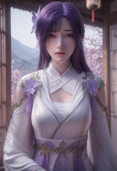 Yun_**_new,1girl,hair ornament,purple hair,long hair,solo,blurry background,looking at viewer,black eyes,bangs,hair flower,butterfly hair ornament,braid,realistic,<lora:Yun_**_*****_10_illu-000006:0.75>,white dress,purple dress,sash,chinese clothes,long sleeves,clothing cutout,photorealistic,hyperrealistic,<lora:realistic filter [IL]:1>,looking at viewer,standing,(upper body:1.2),close up,head shot,lantern,open window,looking at viewer,indoors,mountains,blossoms,flowers,east asian architecture,beautiful sunrise,warm ambient temperature,