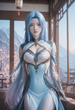Wang_qiuer,1girl,solo,blue hair,multicolored hair,blue eyes,gradient hair,looking at viewer,very long hair,<lora:Wang_qiuer_10_illu-000005:0.75>,dress,clothing cutout,white dress,cleavage cutout,blue dress,photorealistic,hyperrealistic,<lora:realistic filter [IL]:1>,(pale skin:0.8),looking at viewer,standing,one hand on hip,lantern,open window,looking at viewer,indoors,mountains,blossoms,flowers,east asian architecture,beautiful sunrise,warm ambient temperature,