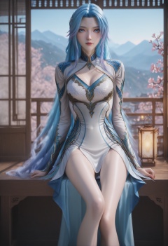 Wang_qiuer,1girl,solo,blue hair,multicolored hair,blue eyes,gradient hair,looking at viewer,very long hair,<lora:Wang_qiuer_10_illu-000006:0.75>,dress,clothing cutout,white dress,cleavage cutout,blue dress,photorealistic,hyperrealistic,<lora:realistic filter [IL]:1>,looking at viewer,sitting,(thin legs,very thin thighs,slim thighs,skinny,slender thighs:1.5),lantern,open window,looking at viewer,indoors,mountains,blossoms,flowers,east asian architecture,beautiful sunrise,warm ambient temperature,