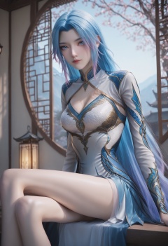 Wang_qiuer,1girl,solo,blue hair,multicolored hair,blue eyes,gradient hair,looking at viewer,very long hair,<lora:Wang_qiuer_10_illu-000006:0.75>,dress,clothing cutout,white dress,cleavage cutout,blue dress,photorealistic,hyperrealistic,<lora:realistic filter [IL]:1>,looking at viewer,sitting,(thin legs,very thin thighs,slim thighs,skinny,slender thighs:1.2),lantern,open window,looking at viewer,indoors,mountains,blossoms,flowers,east asian architecture,beautiful sunrise,warm ambient temperature,