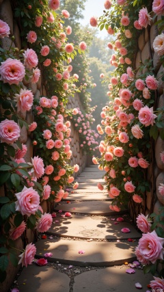 White Rose,Yellow Rose,Purple Rose,A rose garden,a large number of roses,A trail,flower,rich in color,a stone wall,glass bright,glowing inside,Fog,plant,Pine Forest,cloud,Trail,high quality rendering,high-definition picture quality,(ultra-high resolution, 1.2),(realistic:1.4),(8k, Interest),yj,,(romantic:1.3),(flower sea:1.5),(a winding path with flowers on both sides:1.2),sunshine