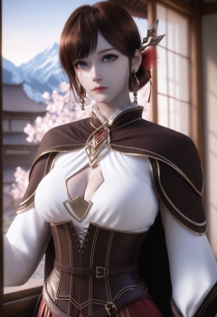 He_di,1girl,brown hair,earrings,hair ornament,jewelry,cleavage,blue eyes,blurry background,short hair,corset,cowboy shot,bangs,<lora:He_di_10_illu-000006:0.75>,cape,gloves,high heels,brown footwear,skirt,thigh boots,long sleeves,red skirt,side slit,clothing cutout,cleavage cutout,photorealistic,hyperrealistic,<lora:realistic filter [IL]:1>,(pale skin:0.7),looking at viewer,standing,(upper body:1.2),close up,head shot,lantern,open window,looking at viewer,indoors,mountains,blossoms,flowers,east asian architecture,beautiful sunrise,warm ambient temperature,