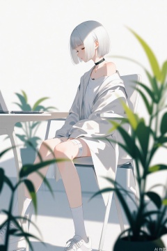 masterpiece,very aware,highres,absurdres,newest,best quality,high quality,chromatic_aberration, //, 1girl, solo, short hair, bangs, simple background, long sleeves, white background, holding, bare shoulders, sitting, closed mouth, green eyes, jacket, full body, white hair, grey hair, shoes, choker, socks, off shoulder, sleeves past wrists, tattoo, chair, white footwear, white jacket, plant, white socks, sneakers, bandaid, grey jacket, computer, bandaid on leg, bandaid on knee, grey socks //, ,(artist:quasarcake:0.8),extreme aesthetic,(wlop:0.6),(wanke:0.8),(mon (monmon2133):0.5),(mochizuki kei:0.95), (tira 27:0.7), //, official art,depth of field,detailed light,blurry background,best shadow,shiny skin,cinematic lighting,ray tracing, amazing quality,very aesthetic,absurdres,beast quality,ultra detailed,newest,8K,HDR,