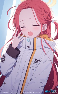 masterpiece,very aware,highres,absurdres,newest,best quality,loli,petite,high quality,chromatic_aberration,Light Blue Theme,cinematic_angle,dutch angle,//,1girl,yuzu_\(blue_archive\),solo,red_hair,long_hair,jacket,open_mouth,yawning,closed_eyes,white_jacket,braid,forehead,blush,long_sleeves,tears,upper_body,one_side_up,copyright_notice,copyright_name,company_name,//,//,//,<lora:BA02:1>,