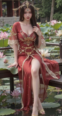 SFW,(masterpiece:1.2),best quality, a young woman Sitting on the giant lily leaf in the pond. She is wearing a long red|blue dress with design on the chest and sleeves. The dress has a high neckline and short sleeves,Holding a lotus in hand. She has long hair styled in loose waves and is wearing gold high heels. The woman is posing with one hand on her hip and the other resting on the edge of the bench. The background is filled with pink and white lotus flowers and green leaves. The overall mood of the image is peaceful and serene,(huge breasts:2.99),(full breasts:2.99),(Background with traditional Chinese architecture, lotus pond and pink lotus flowers:1.39),XtianqiongY,XliumeiY,large natural breast,soft breasts,XyueliuY,XlishaoyinY,Xyunwangshu