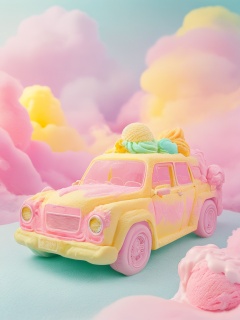 mibjl, colourful, colorful, pastel, ice cream, vintage car, yellow car, pink car, cloud background, cotton candy clouds, rainbow colors, whimsical, sweet treats, dessert, soft textures, pastel yellow, pastel pink, pastel orange, pastel blue, pastel green, food art, surreal, fantasy, dreamy, cute, playful<lora:万物冰激凌sd1.5_D1.3:0.7>,
